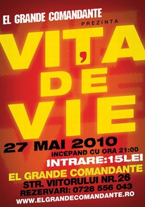 Diseara, de la 21:00, in El Grande Comandante, baietii de la Vita de Vie vor sustine un concert asteptat cu nerabdare de fani. Amanat “din motive independente” de pofta ce-au poftit baietii¸ concertul programat pe 6 mai s-a mutat cu catrafusele pe 27 ale aceleiasi luni – adica azi, in acelasi club desigur.