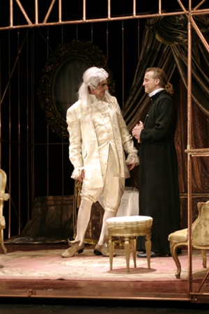 Multe alte nuante, insa, cad pe altarul redarii teatrale, victime colaterale in translatia de la cuvantul scris la textul interpretat pe scena – deloc in ultimul rand, tensiunea sexuala dintre marchiz si abate, incrancenati intr-un duel al replicilor din care primul iese castigator doar prin tertipuri, mai exact prin aluzii sexuale. Rush si Joaquin Phoenix, in “Quills”, ridica temperatura pana la fierbere, mocnesc impreuna la o intensitate pe care schimburile dintre Zamfirescu si Dan Badarau nu o pot egala. La fel, iubirea naiva, nerecunoscuta nici de ei, care se dezvaluie treptat in film intre abate si Madeleine – si pe care piesa o declara doar, nelasandu-i loc sa creasca de la sesiunile de citire din primele scene la sexul post-mortem al ultimelor.