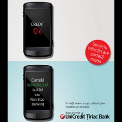 UniCredit Tiriac Bank lanseaza serviciul non-stop de reincarcare a cartelei. Adica ai sute de locatii deschise non-stop pentru tine de unde poti reincarca. Mergi la orice ATM sau Non Stop Banking UniCredit Tiriac Bank, alegi operatorul de telefonie dorit, alegi suma cu care vrei sa reincarci, poti plati cu cardul sau cash la Non Stop Banking si cartela ta va fi reincarcata automat.