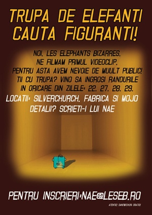 Duminica programul incepe dis de dimineata pentru fanii dedicati ai firavei nise de muzica indie. Trupa Les Elephants Bizarres isi filmeaza un videoclip, primul de fapt, si ca atare merita sustinerea noastra, in bloc! Au anuntat ei pe Facebook ca vor figuranti –pentru o scena cat mai veridica a unui concert LEB – “cata frunza si iarba” zice solistul. Din experienta proprie ca “groupie” (fana de cursa lunga!) a baietilor, pot sa garantez ca daca se vrea realist cadrul cu publicul, va trebui sa ne prezentam cu totii la datorie – deci, duminica, de la 10:00 la 18:00, in Silver Church, haideti sa le dam elefantilor o mana (sau o suta) de ajutor! Pentru inscrieri, scrieti-i lui Nae, la nae@leseb.ro