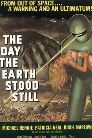 The Day the Earth Stood Still – Tot ca raspuns la fricile paralizante de-atunci, cineastii au scos pe banda rulanta filme SF, horror, sau fantastice care sa contracareze vanatoarea de comunisti initiata de administratia acelor vremuri. Cu alte cuvinte, extraterestrii erau pe post de “rosii”, ceea ce putea rezulta intr-un Klaatu pacifist (jucat de Michael Rennie) in filmul la care ma refer aici, sau intr-un scenariu mai terifiant (“The War of the Worlds”). In “TDtESS” (reinventat de curand cu Keanu Reeves in rolul principal), mesajul moralizator tine de domeniul evidentului – natiunile Pamantului trebuie sa invete sa lucreze impreuna sau se vor prabusi una cate una, ca sa-l parafrazam pe Banjamin Franklin.