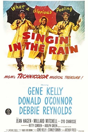 Singin’ in the Rain – Muzicalurile au decolat in anii ’50 cu mare fast, nu in mica masura pentru ca, daca se cerea o scapare din realitatea instabila (si, “gratie” Razboiului Rece, se cerea), numai un asemenea gen de film o putea livra – adica unul unde excesele erau la ordinea zilei si pe toate planurile. “Singin’...”, ca si predecesorul lui din ’51 “An American in Paris”, este un adevarat panaceu pentru orice ti-ar putea atarna pe suflet: povestea curge spre un inevitabil happy-end, personajele se exprima mai mereu prin cantec si dans, pe scurt realitatea acestui “muzical integrat” (unde dialogul se preschimba in vers la fiecare pas) este atat de paralela cu realitatea in care traim incat ne farmeca instantaneu. Firul rosu al filmului ia in vizor tranzitia de la filmele mute la cele sonore, petrecuta in anii ’20 si deci destul de veche incat sa poata fi abordata in registru comic – iar Gene Kelly, cu faimosul lui numar prin ploaie, are un talent pretios de-a te imbia la zambet negresit.
