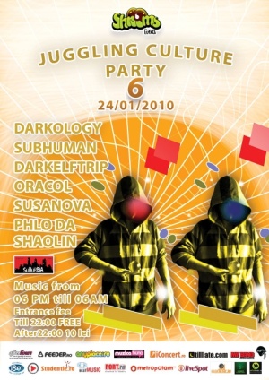Duminica, in Suburbia, se reia seria de evenimente cunoscuta sub numele de “Juggling Culture Party”, unde la aceasta a sasea editie intrarea e libera pana-n 22:00 si doar 10 RON dupa. Muzica, chill in prima parte a serii (Phlo da Shaolin si Subhuman) si apoi demarand in forta cu psy full-on si dark (Darkology, Darkelftrip, Oracol si Susanova), va acompania jongleriile performerilor.