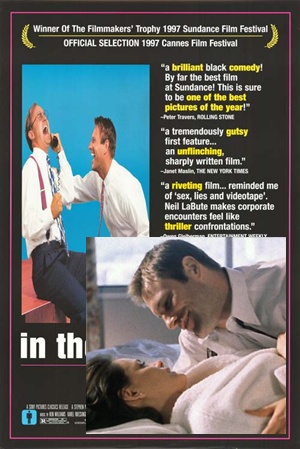 5. Chad in "In the Company of Men" (Aaron Eckhart) - Chad este “jumatatea” aroganta a lui Howard, propriul lui Tyler Durden, cu amendamentul ca este un ticalos in carne si oase nu dedublarea unei minti schizoide. Filmul este primul succes al regizorului-scenarist Neil LaButte, acela care avea sa dea tonul lucrarilor sale ulterioare – barometru al psihologiei umane, in general meschina, reprobabila, socant de dispusa la acceptarea amoralitatii in mediul capitalist. Chad, in interpretarea bulversanta a lui Eckhart (premiat pentru debut la gala Indie Spirt), cloceste un plan de razbunare la scara mica impotriva tuturor femeilor care submineaza patriarhatul de la carma societatii. El planuieste ca, impreuna cu Howard, sa ii “smulga covorul de sub picioare” unei tinere ingenue, doar de dragul de a vedea o femeie pusa la punct; si totul in scop “terapeutic”, se justifica el, avand in vedere cat de sub papuc se simt bietii barbati in noua ordine mondiala – condusa de femei, adica.