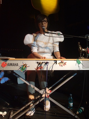 Alexandrina promisese coregrafie pentru seara de joi, ceea ce insuma cu atat mai multe variabile in imaginatia mea cu cat stiam din experienta ca magia concertelor ei se impleteste in mod covarsitor cu factorul static: cantareata se aseaza in fata orgii, si din acel moment, pana la sfarsitul bisului, sala amuteste intr-un fel de transa. Alaturi de fani, si Alexandrina insasi intra intr-o stare eterica, se preschimba in gratie pura, lasandu-si mainile sa invalureze claviatura si vocea sa le tina isonul.
