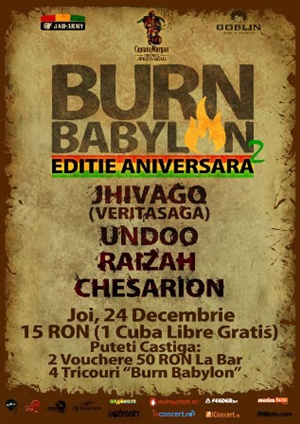 Pentru ca “Jesus Christ Superstar” ne-a invatat ca lui Mesia ii place muzica buna, e dezlegare la party peste tot in Capitala zilele astea: in Goblin, diseara, cu ocazia aniversarii a doi ani de la prima editie “Burn Babylon”, suntem invitati sa ne imbatam (bautura e gratis!) si sa ne impleticim apoi la dantuiala reggae. Jhivago (Veritasaga) va concerta live, iar 3 DJ Set-uri completeaza line-up-ul pentru o seara... incendiara.