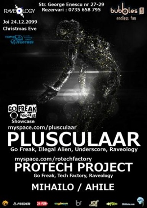 Tot in Ajunul prim, de la 21:30, clubul Bubbles are in vedere ceva cu adevarat alternativ... alternativ la colinde, adica. Nimic nu cred ca e la un capat mai opus fata de spiritul linistit al Craciunului decat muzica techno, iar Plusculaar alaturi de Protech Project, in cadrul unui event marca Raveology, exact asta ne pun pe tapet. Pentru topaitorii din club in club, de la 22:00, mai exista si optiunea de a va indrepta spre clubul Cabaret, pentru cozonaci si vin fiert cu scortisoara alaturi de Raresh & Praslea, El Cezere & Miss I si Alexandru & Sebu.
