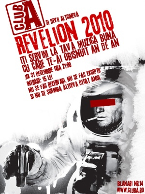 Tot la capitolul noapte de fun fara bataie de cap sau gauri in buget, pe alt calapod muzical, dar in acelasi spirit nonsalant, sarbatoresti si in Club A. Aici nici nu dai ochii bine de afis ca ti-a si trecut panica: de Revelion, precizeaza organizatorii, “nu se schimba altceva decat anul” –asadar, cu aceiasi 15 RON vei dansa pana se crapa de ziua, iar 2009 va deveni 2010 in timp ce tu clipeai. Iar in Club Goblin, intrarea la Rev’ e 50 RON (in care aveti inclus bufet suedez powered by Circul Culinar, un bar de fructe si sampania); de muzica se vor ocupa Snuck si Bazooka.
