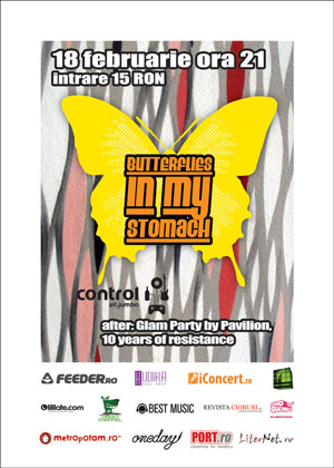 Sezonul concertelor va pune stapanire pe scena din spatele Clubului Control incepand tot de joi, la aceeasi ora 21:00: trupa electro Butterflies In My Stomach, intampinata in 2006 cu laurii acordati pe merit de prestigioasa publicatie Billboard, ne vor delecta cu ecouri funk, nu-jazz, electro, trip-hop si chill. Apoi, de la 22:30, in acelasi spatiu, centrul pentru arta si cultura contemporana Pavilion sarbatoreste 10 ani de rezistenta culturala printr-o petrecere glam rock/glitter punk!