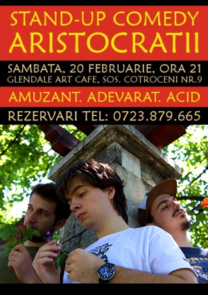 Tot in prima zi de weekend, de la 21:00, la Glendale Art Cafe de pe Cotroceni 9, trupa de stand-up Aristocratii promite un spectacol “amuzant, adevarat, acid”. Radu, Sergiu si Toma arunca manusa sugubeata, gluma dupa gluma te vor provoaca sa razi – poate vei vrea sa te abtii, cand vezi ca niciun subiect nu e prea sensibil pentru a fi luat in raspar, dar, sa fim seriosi, lipsa cenzurii face din weekend Weekend, si sambata asta chiar nu vom fi seriosi!
