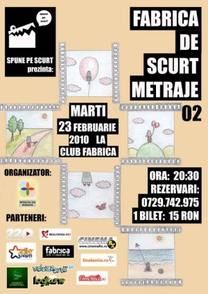 Marti, de la 20:30, in Club Fabrica, festivalul de scurt-metraje Spune pe Scurt va incanta ochiul spectatorului cu o noua editie a “Fabricii de Scurt-Metraje”, pe doua cai artistice complementare: in primul rand, nelipsitele short-uri care de data asta vor fi productii din spatiul romanesc si spaniol, premiate de forurile din bransa. De asemenea, Fabrica va scoate la rampa un artist plastic neconventional, Elis Iaia, care “creeaza obiecte decorativ-narative, pictand pe discuri de vinil cu muzica si povesti din anii '80”.