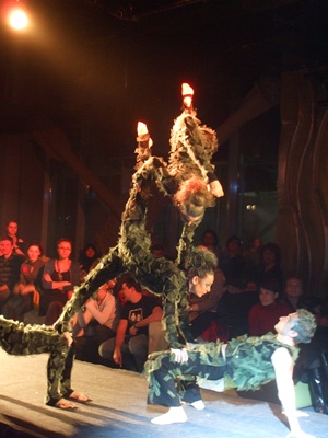 Al doilea moment al serii a fost trupa de contorsionisti “Artistic Events”, care s-au desfasurat – si la propriu si la figurat – pe podiumul instalat in mijlocul Kazeboo-lui. Mai mult decat un act de circ, cu innodari nenaturale si articulatii duble – mie asta mi-ar fi sugerat termenul “contorsionist” – as zice c-am fost martora la un “balet” al unor nimfe de padure, intr-o paranteza atemporala, magica. Mana de oameni, imbracati in frunze a la smochin, iti cam taiau respiratia literalmente aruncandu-se in pozitii de echilibristica, legandu-se si dezlegandu-se in figuri acrobatice, sfidand gravitatia, cum zice cliseul. Iar executia n-a lasat loc de carcoteli – snur, cap-coada.