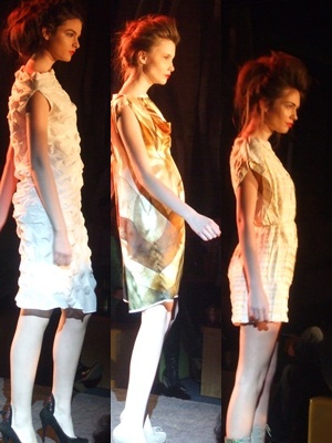 Prezentarea de moda pentru care fusese ridicat podiumul n-a durat mult nici ea, ambele momente – acrobatia si fashion show-ul – lasandu-ma cu sentimentul unor avanpremiere, unor “trailere” care-mi deschideau apetitul pentru variantele lor netrunchiate. Designer-ii Adrian Oianu si Mihaela Glavan au produs pe catwalk o insiruire profesionista de fete – se vadea experienta podiumului din atitudinea modelelor, si anume usor zeflemitoare, usor nonsalanta, dar in acelasi timp extrem de gratioasa – care s-au plimbat pe ritmuri muzicale bine alese, pe tocuri cui si cu pasi siguri.