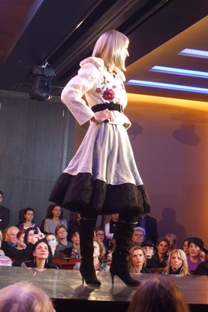 Din categoria, mai redusa-n gabarit, a bilelor albe, s-au numarat tinutele care nu se pierdeau in excese gratuite: cele imblanzite cu plasa, in special, dar si croielile simple terminate intr-un mic artificiu valurit. In plus, am fost impresionata placut de fustele evazate, dar mi-a trecut cand stilul a deraiat in stratificare batatoare la ochi. Nu ma-ntelegeti gresit, si mie imi place sa ma imbrac in straturi, dar combinatiile de materiale propuse de Panait nu vadeau un simt al stilului nonconformist, cat o pasiune pentru opulenta nejustificata nici in tagma haute-couture.
