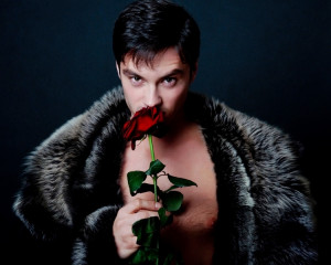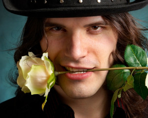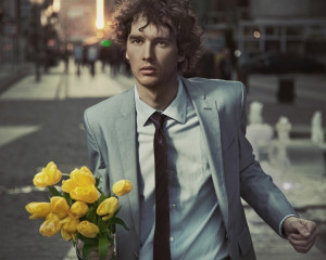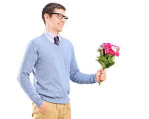 Foto shutterstock barbat cu telefon, shutterstock barbat cu flori si cadou, shutterstock barbat cu trandafir, shutterstock barbat cu lalele, shutterstock barbat pe fundal alb, shutterstock barbat cu trandafir rosu